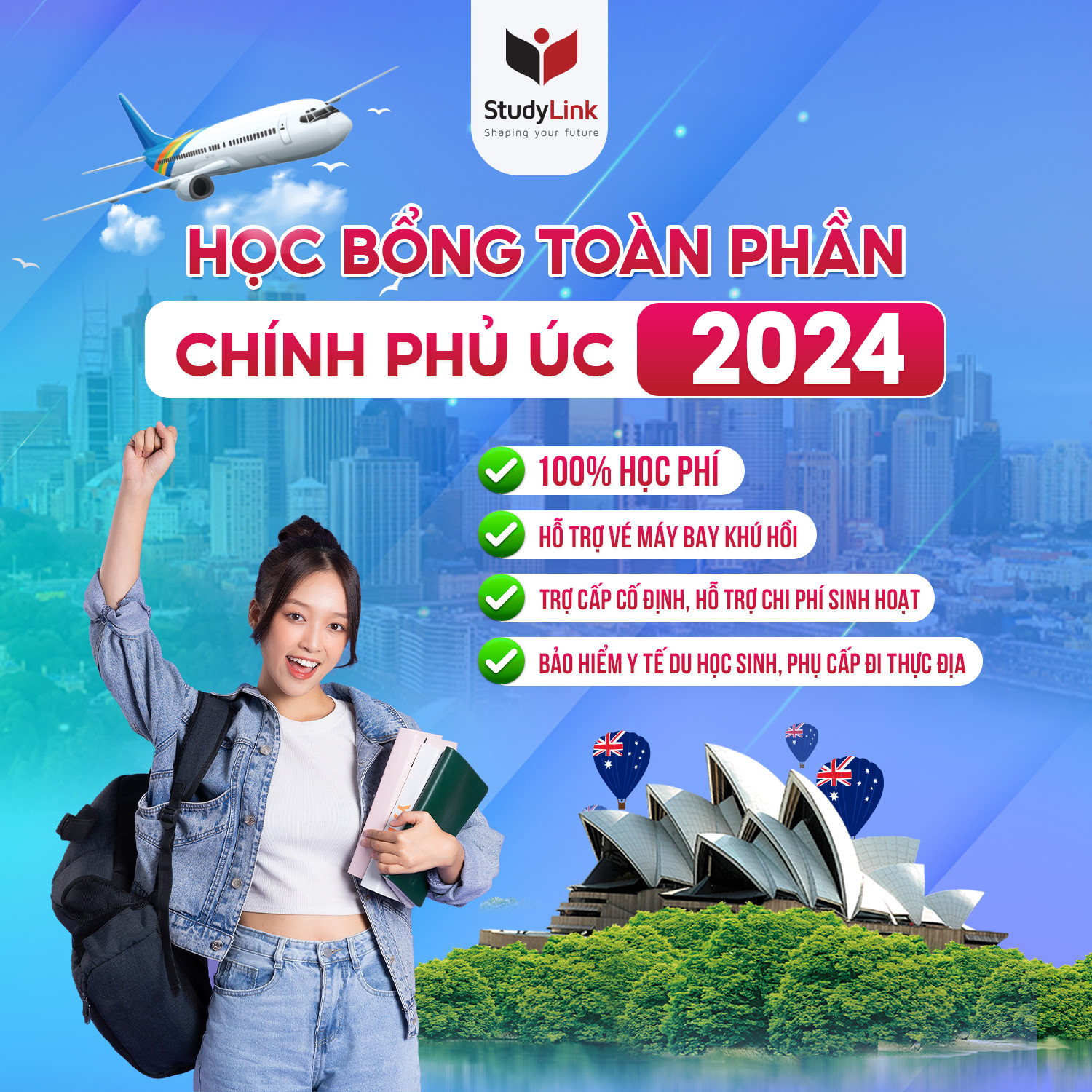 Với 20 năm kinh nghiệm tư vấn du học – định cư, StudyLink cam kết giúp bạn đậu visa du học Úc 100%! Chúng tôi đảm bảo hoàn tiền và đền bù bằng Vàng 9999 nếu không được cấp visa!