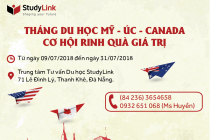 Trong tháng 7 này, Trung tâm Tư vấn Du học StudyLink triển khai “Tháng Du học Mỹ - Úc - Canada” với nhiều chương trình Ưu đãi hấp dẫn dành tặng cho khách hàng khi đến đăng ký hồ sơ Du học.